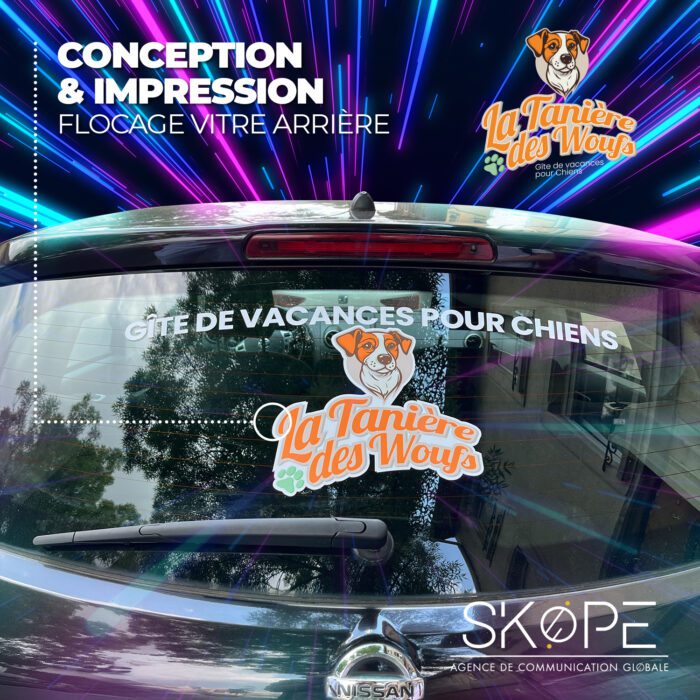 Conception impression flocage vitre arrière la Tanière des Woufs