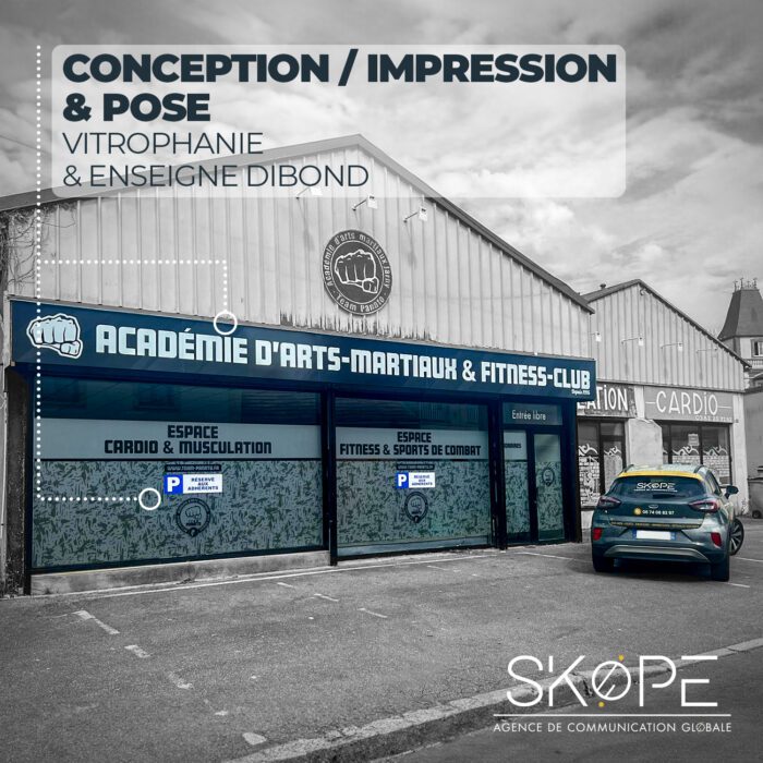 Vitrophanie & Enseigne dibond – Académie d’arts – Martiaux & Fitness – Club